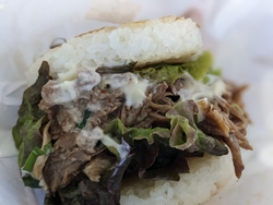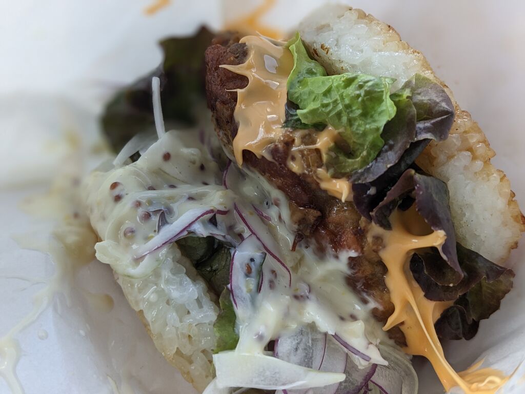 ライスバーガー専門店でテイクアウトしました。メニューがたくさんあり、どれも美味しそう。迷いに迷って、油淋鶏バーガーにしました。生姜が香り、ねぎがシャキシャキで、味もしっかりつき、ごはんと一緒に食べられて幸せでした~。ボリューム満点でとっても美味しかったです!チーズバーグとほぐしチャーシューも購入しましたが、こちらもボリュームがあり、美味しかったです。サイドメニューのもちもちぽてともおすすめです。他には、きんぴら、つくね、のり弁、ハムカツ、だしまきめんたい、タルタルアジフライ、焼肉など、たくさんメニューがありました。 (訪問:2025/09/06)