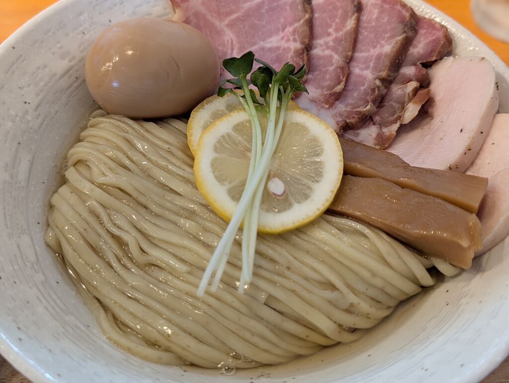 【特製昆布水つけ麺 塩】を券売機で購入。テーブルに置いてある「昆布水つけ麺の食べ方」を熟読して待ちます。先ずは麺だけをいただきます。焙煎胚芽を練り込んであるという麺は香り高く美味しい麵でした。次に”藻塩”をふりかけて・・・。これが私が一番好きな食べ方です。麺本来の味を藻塩が引き出してくれて旨味が増すような気がします。つけ汁にレモンや黒七味などを加えることにより、色々な味が楽しめるのも昆布水つけ麺の魅力ですね。最後に昆布水をつけ汁に入れてスープ割りとしてもいただきました。ごちそうさまでした。 (訪問:2025/09/08)
