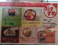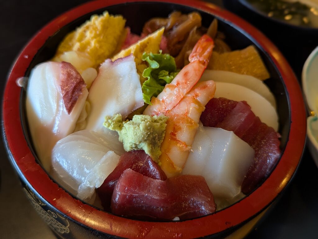 ランチ時にお邪魔しました。ランチメニューの中から【ちらし寿司】を注文してみました。味噌汁とデザートが付き、丼物は大盛りが無料でした。厚めのネタが新鮮で美味しかったです。ちらしには、甘く煮たかんぴょうも入っていて美味しかったです。デザートのプリンがなめらかな口当たりで、これまた美味しかったです。アットホームなお店で、美味しいランチを頂けました。ごちそうさまでした。 (訪問:2025/08/25)