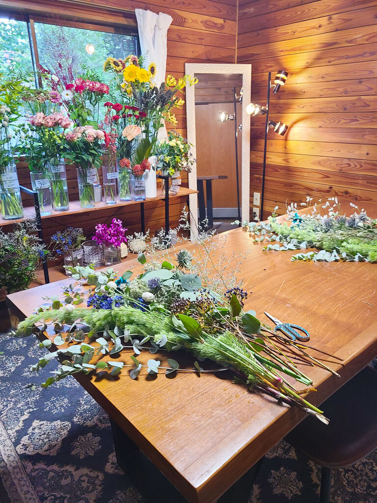 「musubi」は、季節感を大切にした約30種類の花や珍しい植物が並ぶフラワーショップ。1本から購入でき、アレンジメントや花束の注文も可能です。少人数制の1dayフラワーレッスンも開催しており、初めての方でも安心して楽しめます。