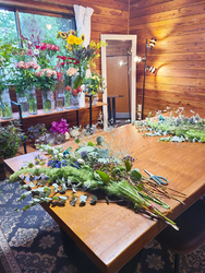 アレンジメント・花束 | ご注文・ご予約は、店頭またはお電話で受け付けいたします。 musubiの得意なスタイルは葉物をたくさん用い、花も葉も様々な種類を取り合わせるナチュラルなスタイルです。 |
