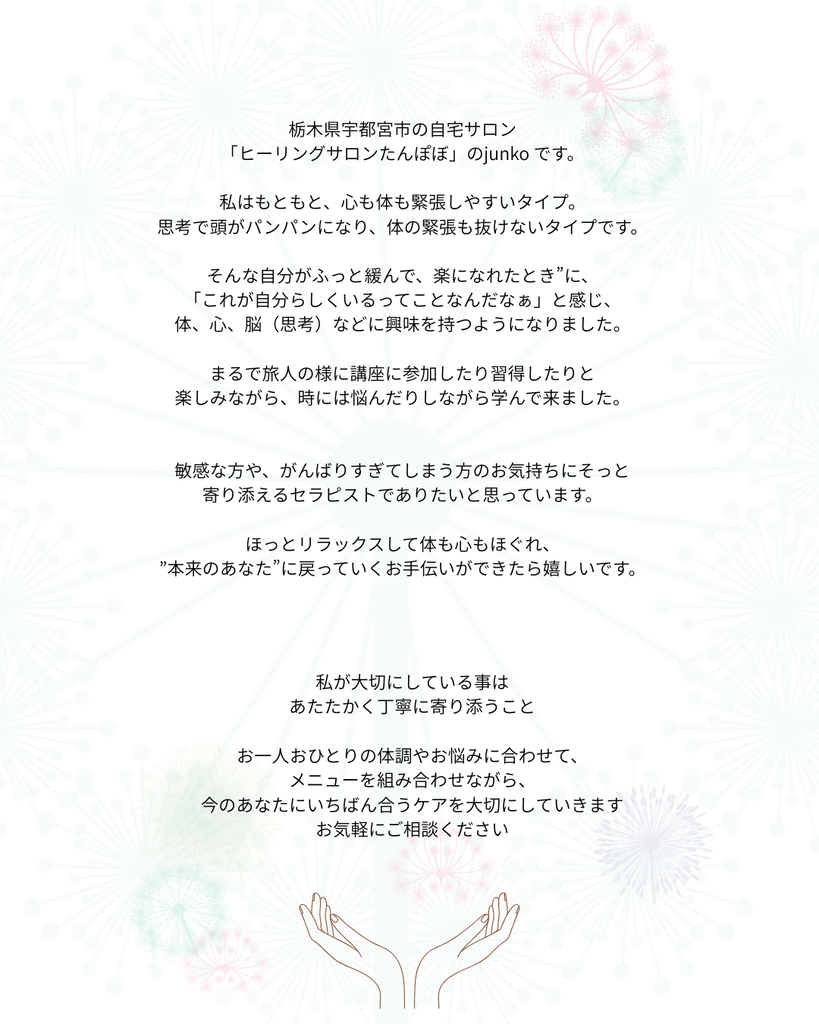 こんな方にお勧めです 敏感で心も体も緊張しやすいタイプの私なので、繊細さんのお気持ちに寄り添えると思っております。