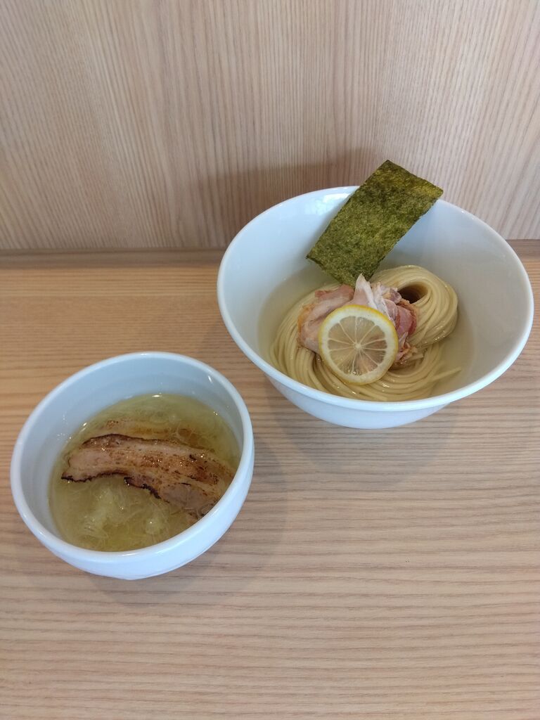 NEWASHITAMO RAMENさんでお昼を食べました。昆布水つけ麺(肉有り)の塩をいただきました。とろっとした昆布水に麺とお肉、海苔にレモンがのってます。つけスープにはチャーシューが入ってます。オシャレな感じのつけ麺です。麺はこしがあってしっかりしていてとても美味しかったです。そのまま食べて、スープに浸けて食べて、残ったスープに昆布水混ぜてと楽しめました。 (訪問:2025/09/19)
