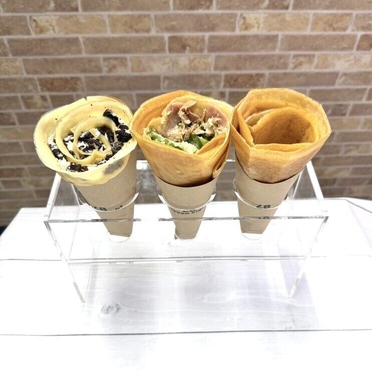 NEWふと夜にクレープが食べたくなって調べたら出てきたクレープ屋さん!平日は18時〜25時、土日祝は13時〜25時の営業だそうです。営業日はインスタで確認してから訪れた方が確実だと思います。メニューは甘い系としょっぱい系どちらのクレープもあり、私はハムチーズ、一緒に行った主人はチョコバナナを頼みました。店員のお姉さんが手際よく作りながら明るく接客してくださり、お店の名前について聞いたら7が逆さまなのは七転八倒の意味を込めたんです〜と教えてくれました!出来立てのクレープはサクサクの薄めの生地で、ハムチーズはレタス、ハム、チーズの具材が最後までたっぷり入っていてボリューム満点!チーズがトロッとしていてとても美味しかったです♪チョコバナナも味見しましたが、クリームが軽くて甘すぎずチョコバナナとマッチしていて、飽きずに食べられるお味でした。他のクレープやトッピングも気になるのでまた伺いたいです! (訪問:2025/12/11)