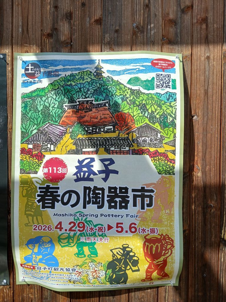約半年前にも買いに来ました。今回も、見ていて、桜の花びらが描かれた湯飲み茶碗が目に入り、お茶を飲むのに買って来ました。いろんな種類の焼き物がたくさんあり、見ているだけども、とても楽しかったです。そして、4月29日から5月6日までの春の陶器市のポスターが、貼られていました。 (訪問:2026/03/09)