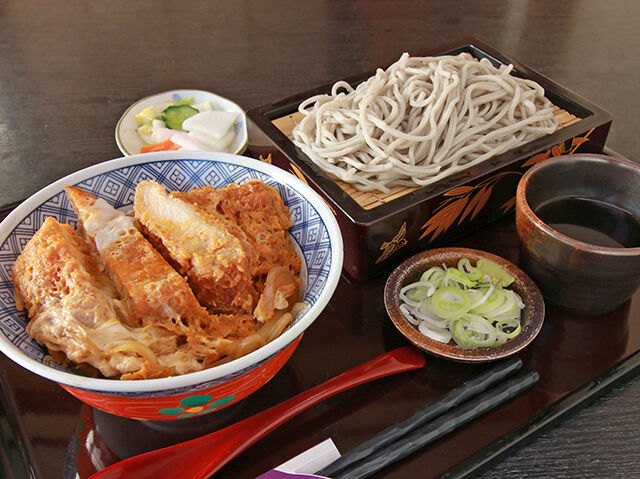 男性人気No.1!カツ丼麺セット 栃木県産ブランド豚のさくらポークを厚めに切ったボリュームと、肉の旨味が引き立つ鰹風味の甘じょっぱい出汁で煮込んだTHE蕎麦屋のカツ丼。麺セットは+350円で丼や定食に付けられます。1,380円。