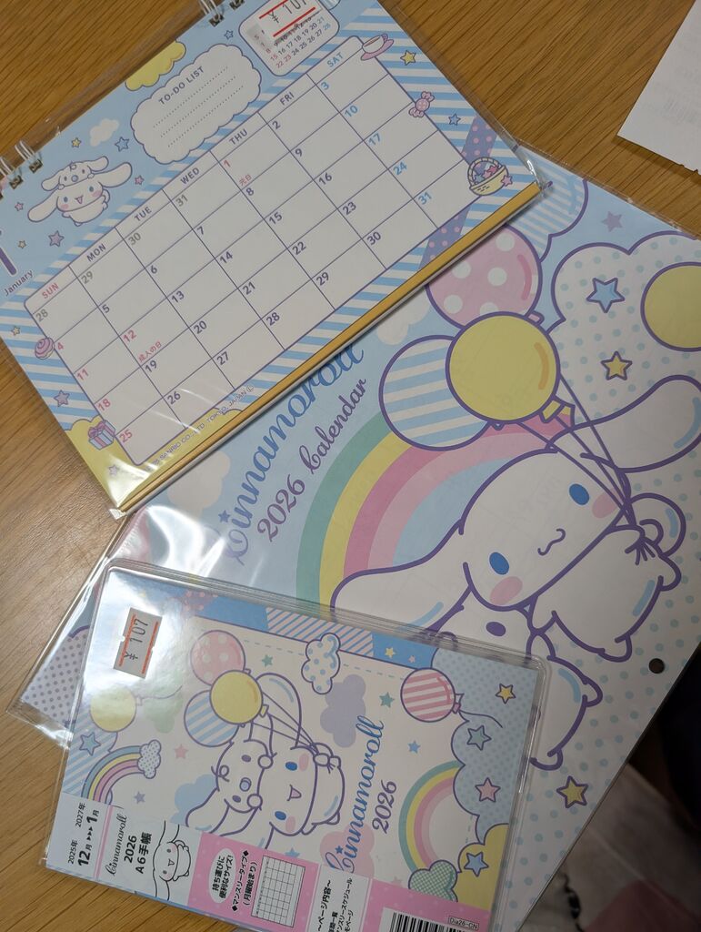 NEW2階の文房具売り場にはお買い得商品があります。今回は大好きなシナモロールのスケジュール帳、卓上と壁掛け2種類のカレンダーがそれぞれ107円でした。スケジュール帳は子どもが欲しいとのことであげましたがイラストがカワイイカレンダーなので大満足です。 (訪問:2025/11/19)