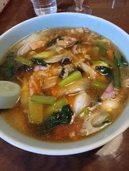 2021.10.16(土)13:40訪問。先客五名、後客なし。本日のランチは、佐野市内のこちらで。佐野イオンから北にむかうとあります。日替わり定食にしようと思いましたが、時間的に終わっちゃったそうなので、五目うま煮ラーメン850円をオーダー。店内、厨房は息子さん、接客はお母さんのようで、常連さん相手にお話ししてます。ほっこりです。そして待つこと約8分、着丼。まずはスープ。しょう油強めであっさり。麺は平打ち太め。広東麺系でこの麺は珍しいですね。餡は、白菜、青菜、ニンジン、ネギ、ナルト、豚コマ、ハム、エビ、キクラゲ、うずらの卵など。ごちそうさまでした。 (訪問:2021/10/16)