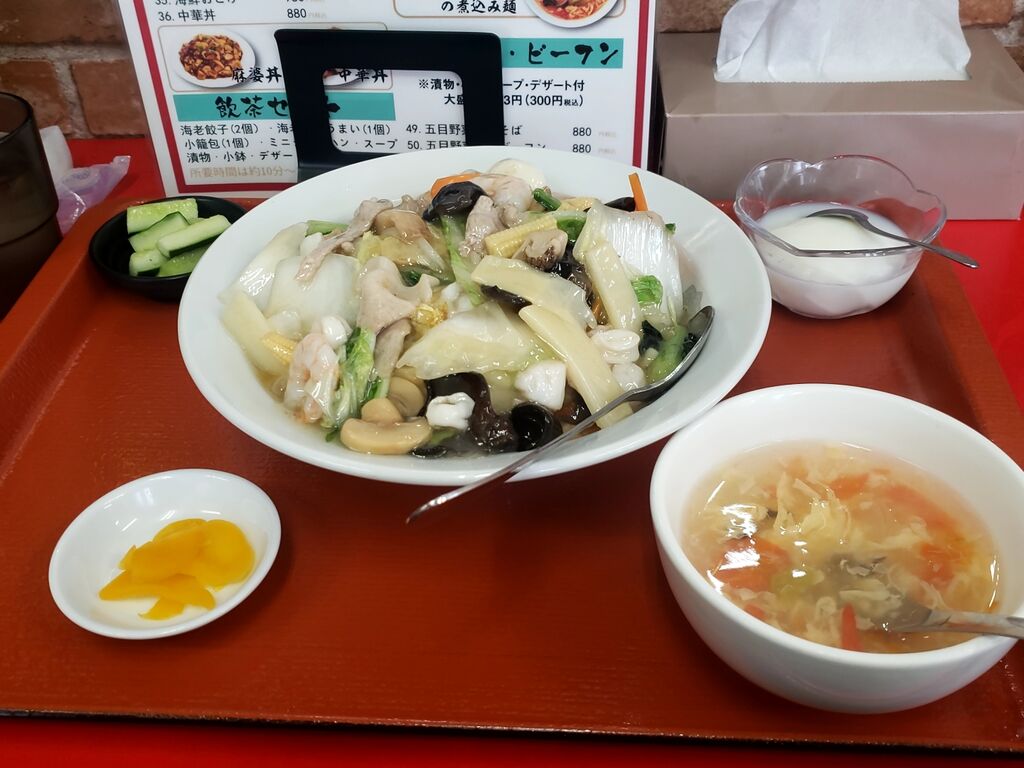 ボリュームのあるコチラのランチから、本日も八宝菜あんかけ玉子チャーハンを頂きました!後からメニューを見て気づいたのですが、八宝菜のセットより安いんですね~~ お得感満載!!エビにイカや貝柱などの海鮮もたっぷり、シンプルな玉子チャーハンとの相性抜群♪︎今日は玉子とトマトの酸味があるスープでしたが、コチラも旨し!満腹満足でごちそうさまでした~~ (訪問:2024/06/29)