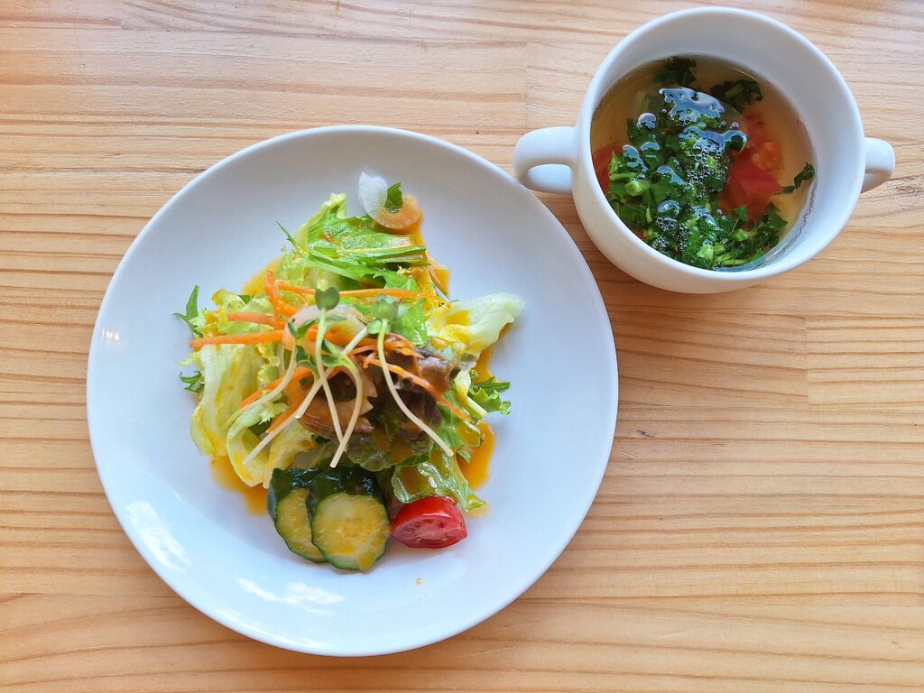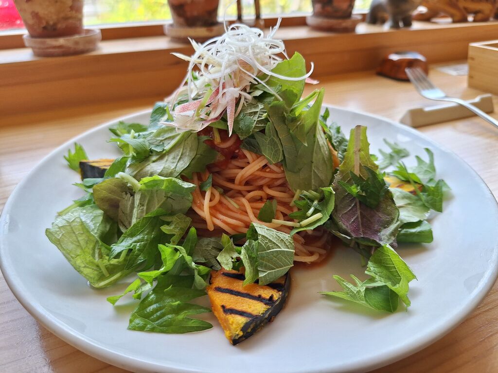 ランチにと12時少し前にお邪魔しました。混雑を覚悟していたのですが、無事着席!が、その後12時過ぎに続々とご来店があり、ラッキーだったよう。昨年も頂き、とっても美味しかった『カボチャとトマトの冷製パスタ1650円』に、『本日のデザート(レモンロールケーキ&苺シャーベット)300円』をつけてスタンバイ。お野菜もりもりのサラダに、モロヘイヤの冷製スープが登場。お野菜大好きには嬉しい山盛りのサラダ、ドレッシングが美味しくてニンマリ^^冷静スープはお出汁がしっかり効いていて、奥深い味に。そうしてメインのパスタが登場。たっぷりのパスタが全く見えないほどのお野菜の量‼昨年もビックリさせられましたが、今年もボリューミーさにビックリです。フレッシュなお野菜をモグモグ、香ばしい香りと甘いカボチャも美味しくペロリしながらようやくパスタに。トマトベースでさっぱりと、甘味もあり美味しいソースに舌鼓☆いくらでも食べられてしまいそうな美味しさです。食後にはレモンロールとイチゴシャーベット。暑いこの時期に嬉しいさっぱりスイーツ‼レモンのお味があと引く美味しさのロールケーキと、濃厚なイチゴが楽しめるシャーベットのお陰で、最後まで大満足のランチを堪能させていただけました。次回の訪問も楽しみです。 (訪問:2025/06/28)