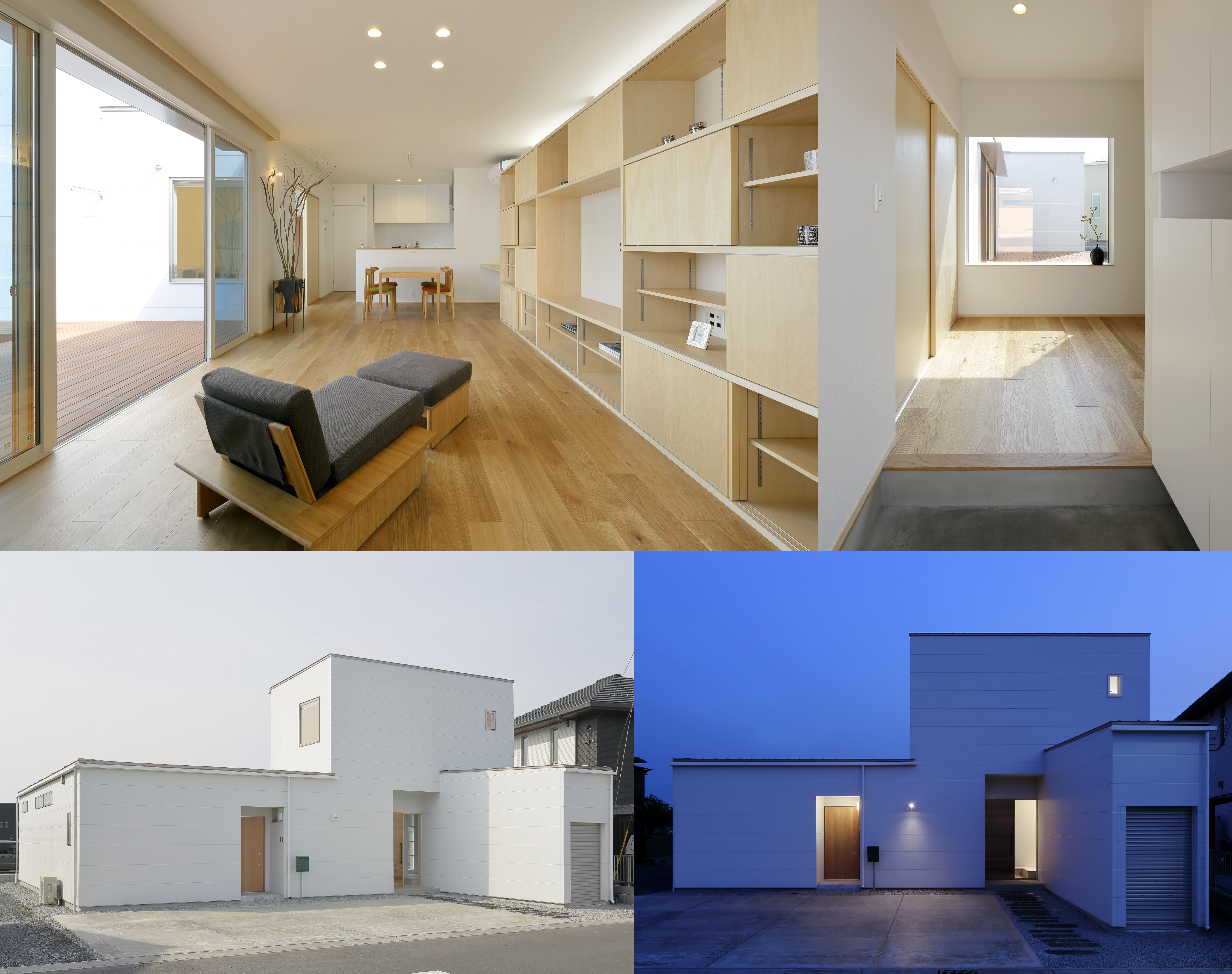 【光芒の家】 南側に広く田園を見渡せ、自然を感じるこの場所を活かすため、田園側に開放したL型プランを採用。特徴のある勾配天井と北面に設けた天窓を組合わせ柔らかな光が室内に差し込む平屋の住まいです。