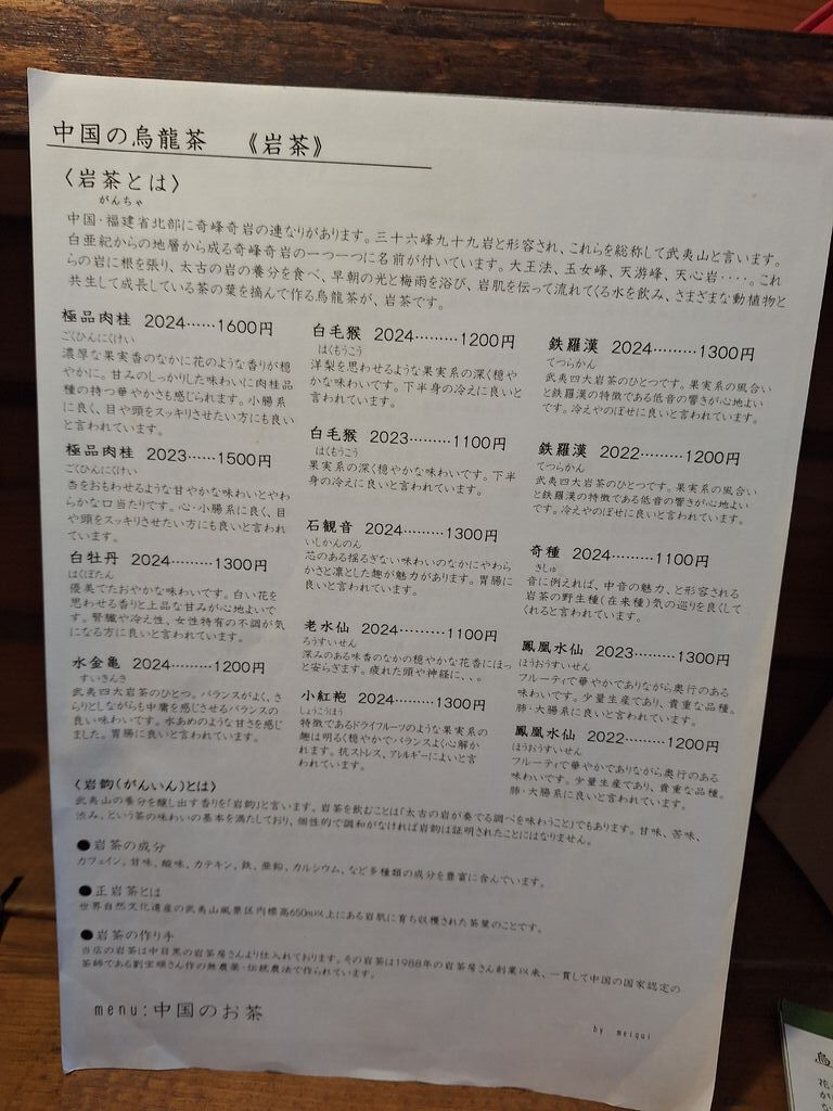 癒しには中国茶と言えるほど、疲れたときにぴったりなお飲み物。今回は販売用の茶葉に記載してある、お茶愛溢れる店主さんの一言で、ものすごーく気になってしまった『杉林渓鉄観音1100円』に『チーズケーキとのハーフセット520円』を添えてオーダー。鉄観音といえば某有名飲料メーカーの烏龍茶で、スゴく好きなジャンルではないなぁと敬遠していましたが、お茶愛溢れる店主さんが美味しいと太鼓判を押すなら絶対旨いはず!とチャレンジ。香ばしい焙煎の香り、うぅ、もしかしたらダメかも…と、一瞬躊躇しつつ頂いてみると、お味は軽やかで、杉林渓特有の爽やかさがあり、後からほんのり甘味で美味しい☆一瞬でも店主さんを疑った自分が恥ずかしい。。。2煎目はこちらで仲良くなったお友達との話しに花が咲き抽出しすぎて濃くなりましたが、それでも美味しいと思えるお味。力強さは半端ありませんでしたが。が、煎を重ねる毎にまろやかさもあり、香りも朗らかに美味しく何煎も楽しめる素敵なお茶でした‼大好きな豆花と、コクもあるけど爽やかさが癖になるさっぱりチーズケーキで毎度悩み、そんな私に嬉しいハーフ&ハーフ!小振りなので、悩んだ時は絶対おすすめのおやつです♪お友達とお茶を飲み、たくさん話して、美味しくて…。幸せな時間で心が癒されました^^居心地の良い空間とお茶、それらを作ってくださる店主さんには頭が下がりっぱなしです。 (訪問:2025/10/13)