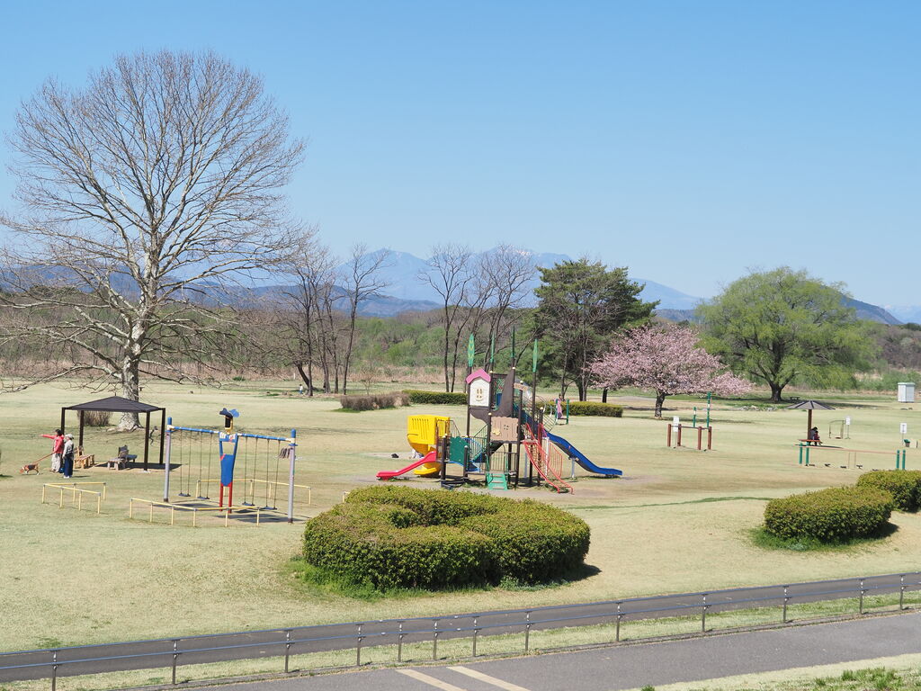 鬼怒川の河川敷を利用してつくられた公園で、広大な芝生広場や大池、小川があり、5月~10月頃には水とふれあうことができます。周辺には約2kmの園路や桜づつみがあり、春には多くの人が訪れる桜の名所となっています。