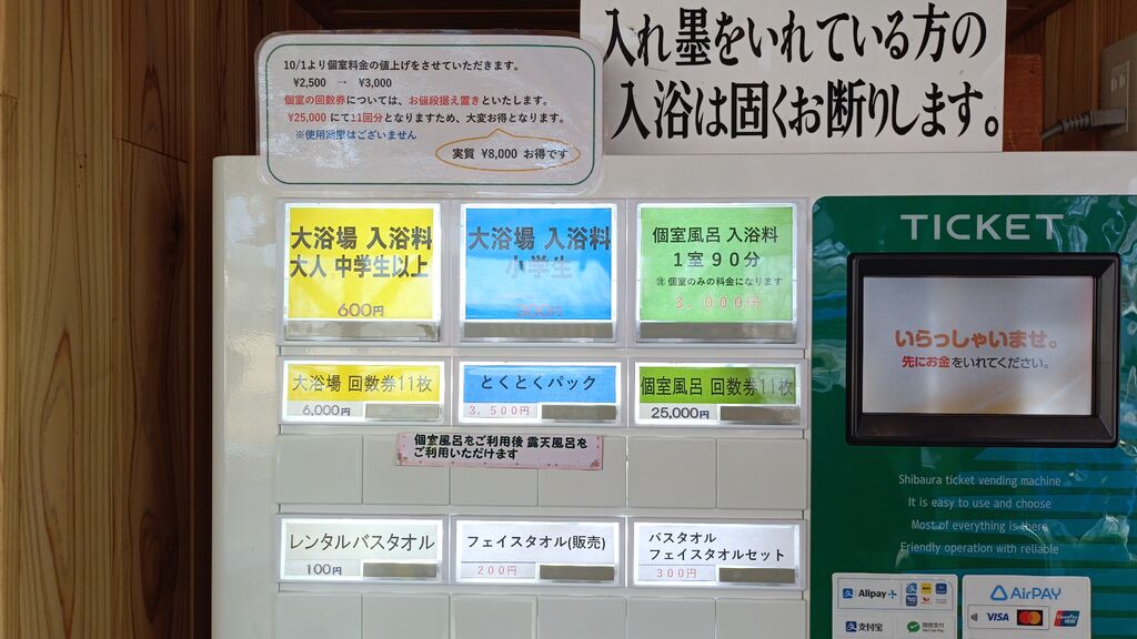 | 屋根付き露天風呂 入浴料 | 大人(中学生以上) 600円 小学生 300円 小学生未満 無料 |