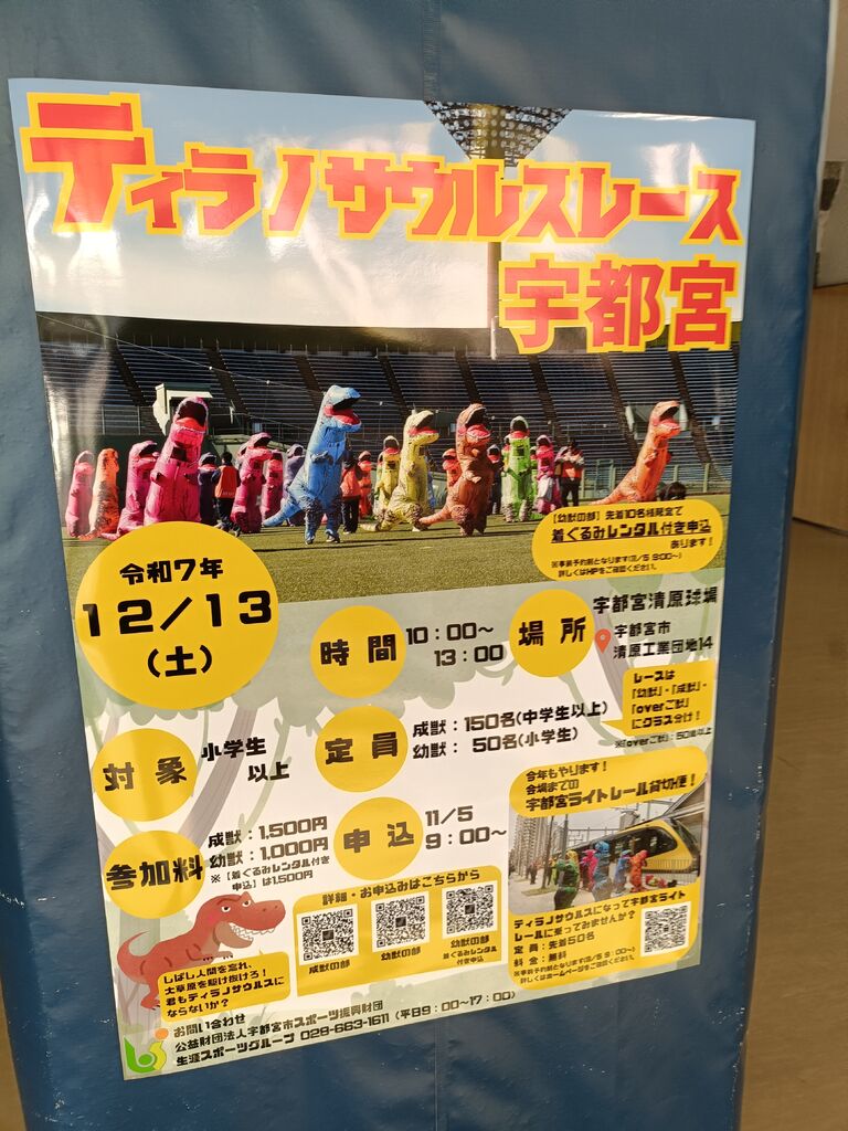 NEWこちら方面で仕事だったので、帰りにトレーニング室で運動しました。ブレックスアリーナに比べると狭いですが、マシンが新しめなのが良いです。12月に近くの清原球場でティラノサウルスレースが行われるようですね。 (訪問:2025/11/06)