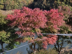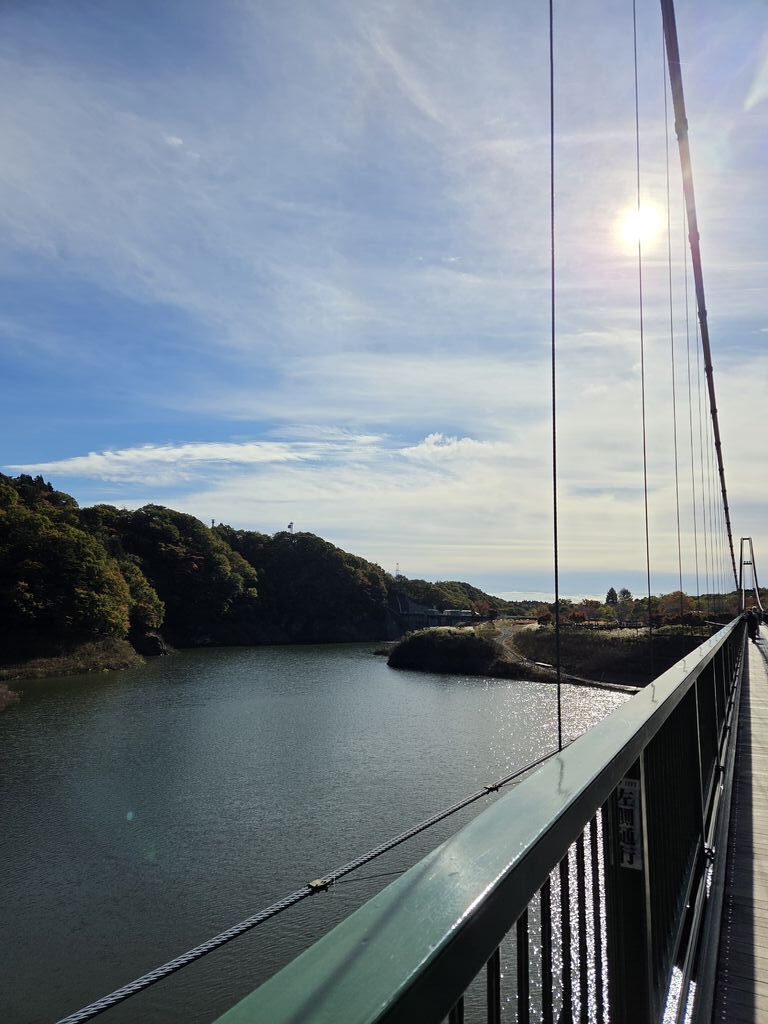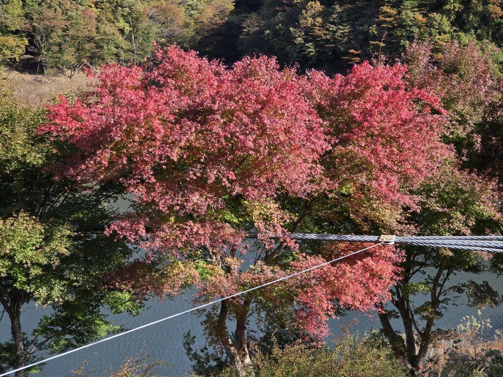 もみじ谷大吊り橋には、沢山の観光客が来ていました。有料の吊り橋です。外国人の家族も来ていました。かなり揺れるんですね。吊り橋からの眺望も抜群でした。橋を渡りきると、直ぐに、恋人の聖地の記念碑が有りました。 (訪問:2025/11/03)