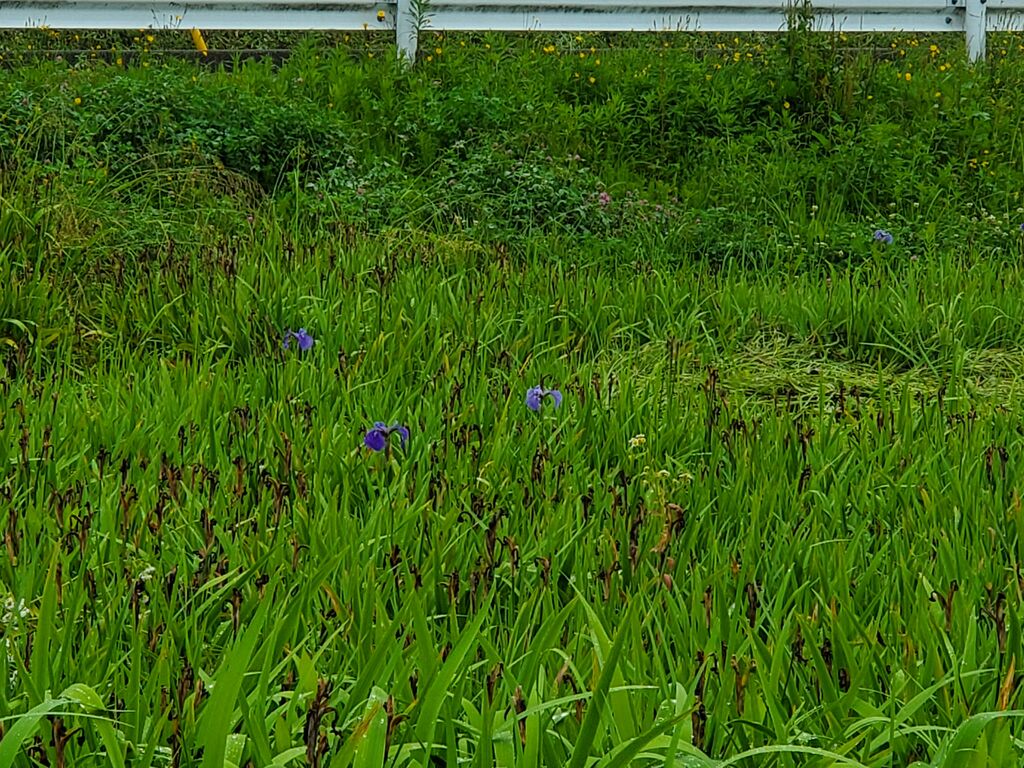 コーちゃんの口コミを拝読して遂に咲いている時期に眺めることができました。絶滅危惧種のナスヒオウギアヤメは県道68号線を挟んだ休耕田2ヵ所に約2千株が群生しております。ここに来る前に那須塩原市の自生地を見てきたのですが花々の色合いが違いますね。そこで見たナスヒオウギアヤメは青紫色をしておりました。薄曇りの陽射しが気品のある綺麗な花色が見られるとのことです。雨が降っているので紫色の花々は勢いを増し活発な様子でした。この後にモウ一つの那須町のヒオウギアヤメ群生地を見に行く予定です。 (訪問:2024/06/01)