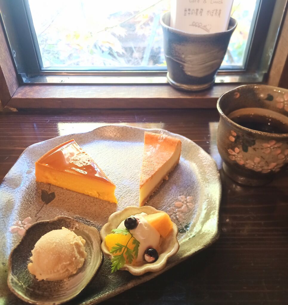 NEWチーズケーキ、かぼちゃプリン、キャラメルアイスの3品プレートをいただきました。こっくりとしたやさしい甘さのかぼちゃプリンが絶品です。ドリンクバーはコーヒーやアッサム等種類が豊富です。コーンスープやオニオンスープもあります。りんご酢が美味しくておすすめです。 (訪問:2025/11/02)
