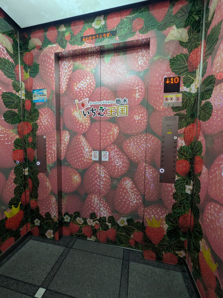 栃木県庁15 階にあるダイニング十五家に行ってきました。地下の駐車場は2 時間無料です。エレベーターがいくつかあるのですがその中の1機だけでしょうか?中がイチゴだらけ!ぜひ乗ってみてください。 (訪問:2026/03/11)