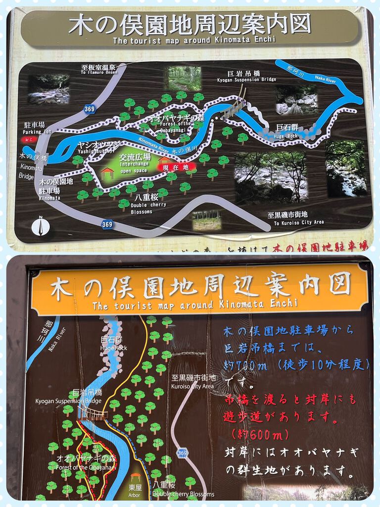 | ◇木の俣橋から下流側には本流那珂川との合流点まで遊歩道が整備され、植物や大岩奇岩などが作り出す景色に自然の偉大さを感じながら散策を楽しむことができます。 | |