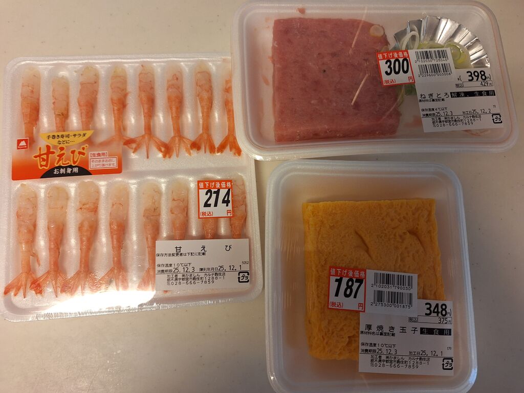 栃木銀行と足利銀行のATMや、お隣のマツキヨやseria利用もあり、夕飯のおかずを買いに寄りました☆“ねぎとろ”に“むき甘えび”に“厚焼き玉子”で海鮮丼に、“マヨたまカツ”の揚げ物に、“ちょこっと鍋セット”の汁物…オフシールが貼ってあるお値下げ品を多数購入しちゃいました(^ー^) (訪問:2025/12/03)