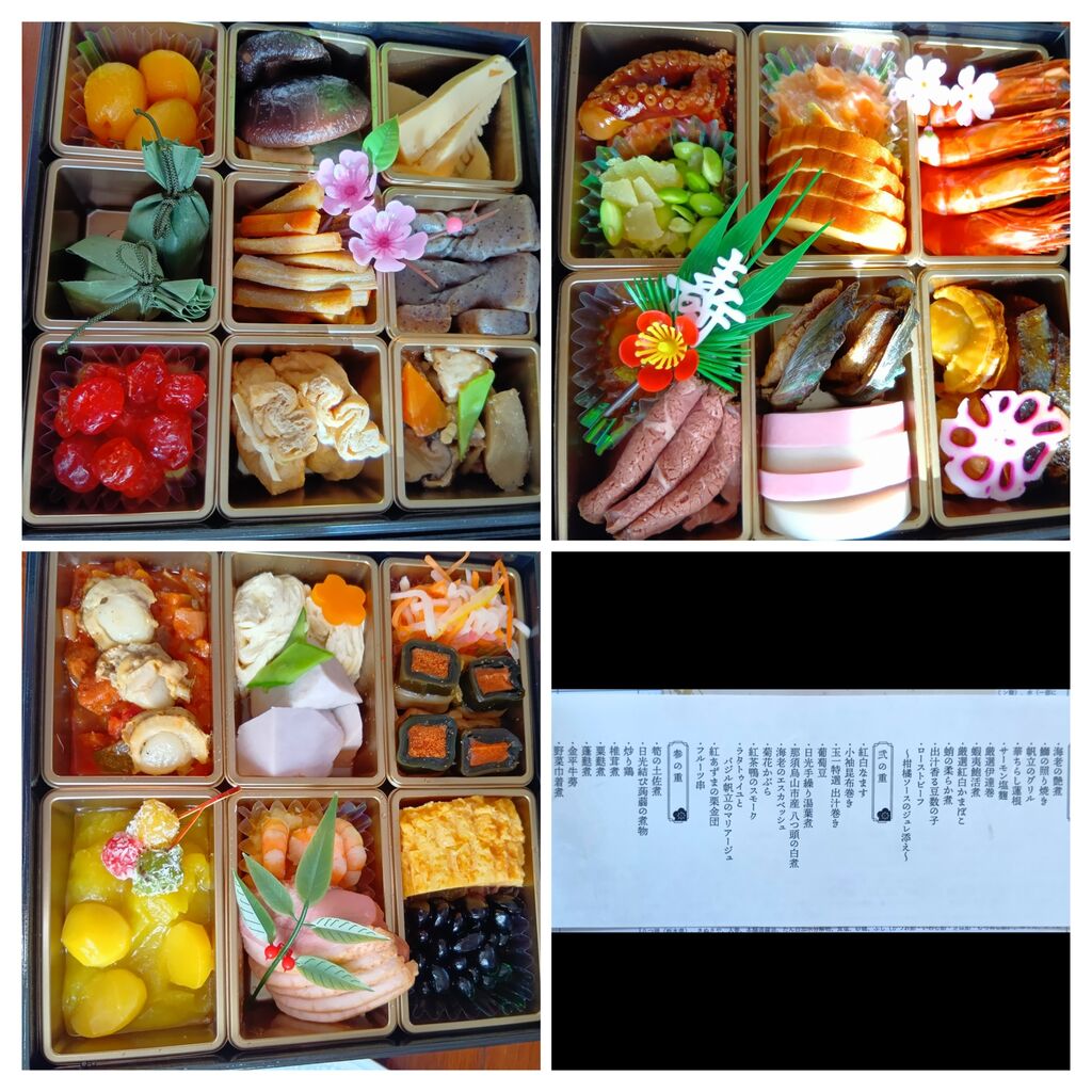 NEW明けましておめでとうございますm(__)m。。。今年の正月も“あぜみち”さんの『おせち』で我が家の新年が始まりました(^o^)/。。。最近のお正月は『あぜみち』さんのおせちを毎年購入しています(*^^*)v。。。以前に“あぜでり”さんの料理を食べる機会があり、とても美味しかったからです(*^^*)v。。。『あぜみち』さんのおせち料理は、全店舗で500セット限定で予約販売をしていて、今回は少し遅くまで受付していて12/25が締め切りでした(*^^*)。。。また、例年は受け取りが12/31の開店~13:00の一択でしたが、早期申込み&店頭予約限定で先着200組が前日15:00~19:00の引取も選べぶ事ができて年末の予定が立てやすかったです(^o^)/。。。おせちには、お品書きの他に各料理毎の原材料表も付いてきますのでアレルギーをお持ちの方も安心して食べることが出来ますよ(*^^*)。。。『農産直売所あぜみち』さんの【おせち】お勧めですゥ〜( ^-^)ノ∠※。.:*:・'°☆ (訪問:2026/01/01)