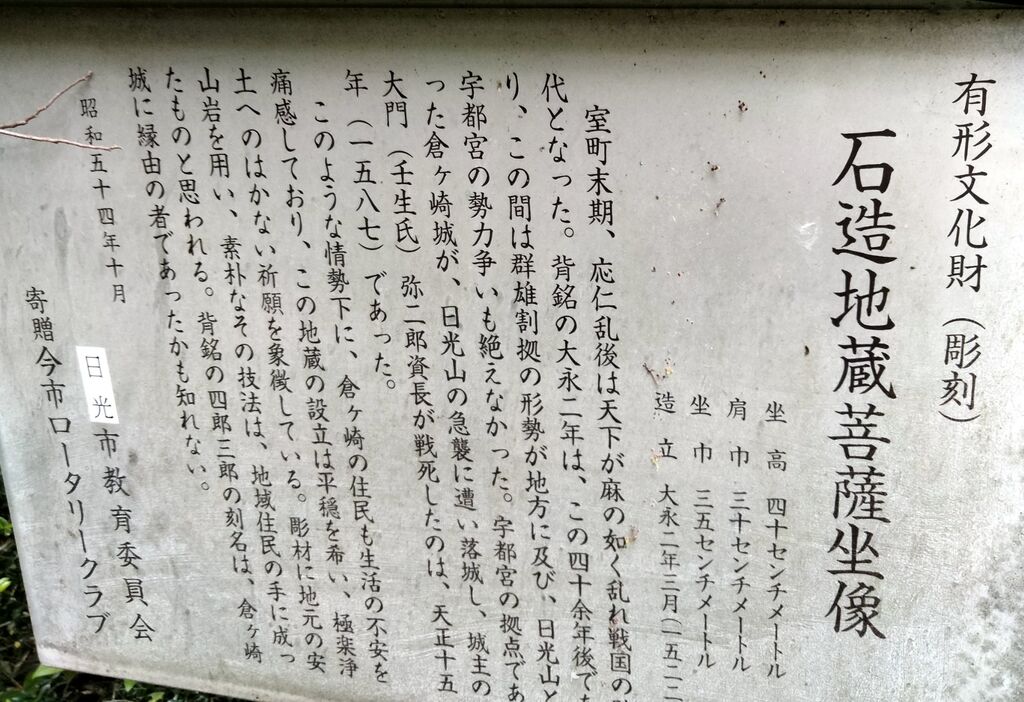 | 中世銘のある貴重な石造地蔵 | 戦国争乱の最中、日光山勢力と宇都宮氏の争いが絶えなかった時期で、天正15年(1587)には宇都宮氏勢力の拠点であった倉ケ崎城が落城。中世銘のある貴重な石造地蔵であり、倉ケ崎城との関連も示唆しています。 |