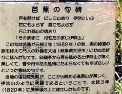 | 芭蕉の句「そのままに月もたのまじ伊吹山」 | 芭蕉が元禄2年(1689)秋、奥の細道の旅を終え門人の斜嶺(しゃれい)を大垣(岐阜県)に訪ねた折りに詠んだ句。斜嶺亭から西を眺めると伊吹山が高く美しく、雪や月や花の風情に頼らずとも素晴らしいという意味 |