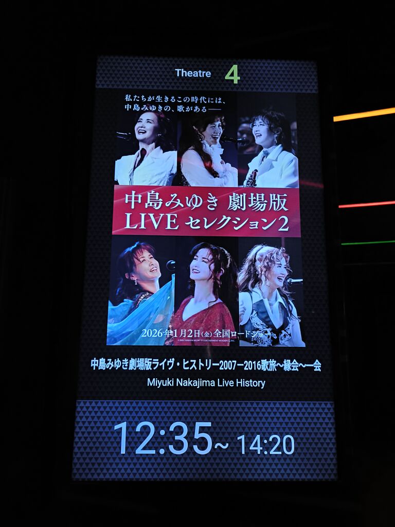 中島みゆき 劇場版 LIVE セレクション2を見てきました。迫力ある映像と音響で圧倒されました!こういった形でLIVEを観るのは初めてでしたが、かなり良かったです♪ (訪問:2026/01/06)