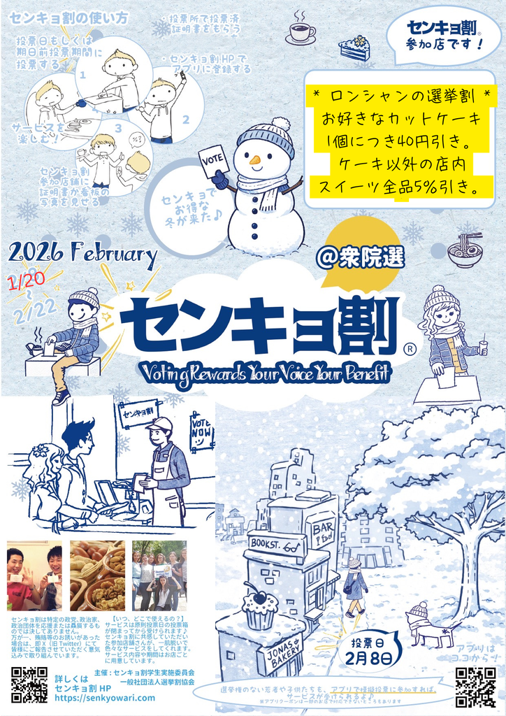 衆院選もセンキョ割やります 衆院選で、「投票済み証」をもらってきていただくと、[お好きなカットケーキ、どれでも1個につき40円引き][ケーキ以外の店内スイーツ全品5%引き ]です!