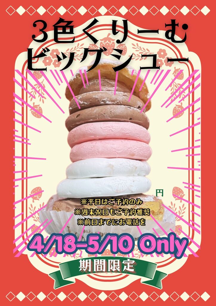 当店イチバン人気のビッグシューを、チョコといちごの生クリームをプラスした、「3色ビッグシュー」として販売します! 平日はご予約のみ。週末祝日もご予約推奨です(お電話でOK)お天気の良い日はクーラーバッグをご持参くださいね♪