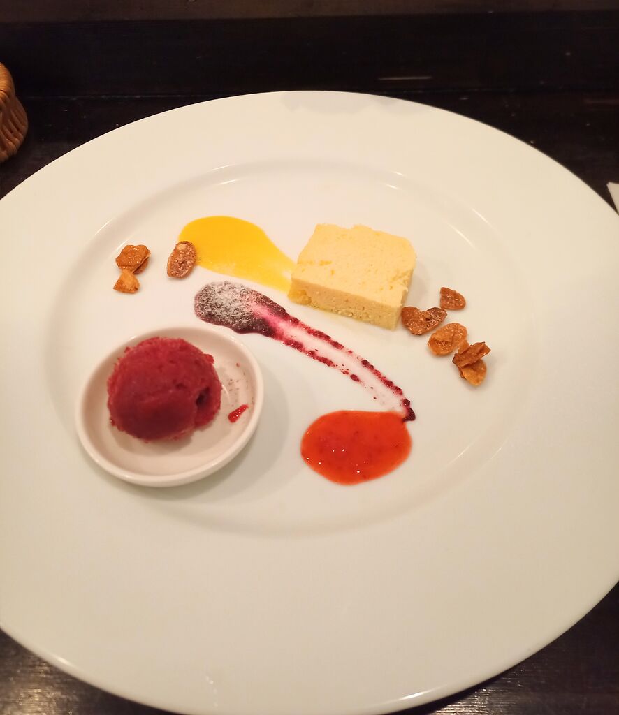 「アルページュセット」(1800円)のランチをいただきました。前菜、メイン、パンかライス、ドリンクのセットです。前菜プレートは生ハムサラダ、くるみと人参のラペ、海鮮パテ、スープでした。メインは「若鶏のオーブン焼きトマト風味のデミグラス」です。バケットと一緒にいただきました。デザートは+200円で「ベイクドチーズケーキ」にしました。美味しいので毎回デザートも頼んでしまいます。キャラメリゼされたアーモンドがカリカリで甘く、カシスのソルベはさっぱりとしていて、食後に嬉しいデザートでした。 (訪問:2026/04/12)