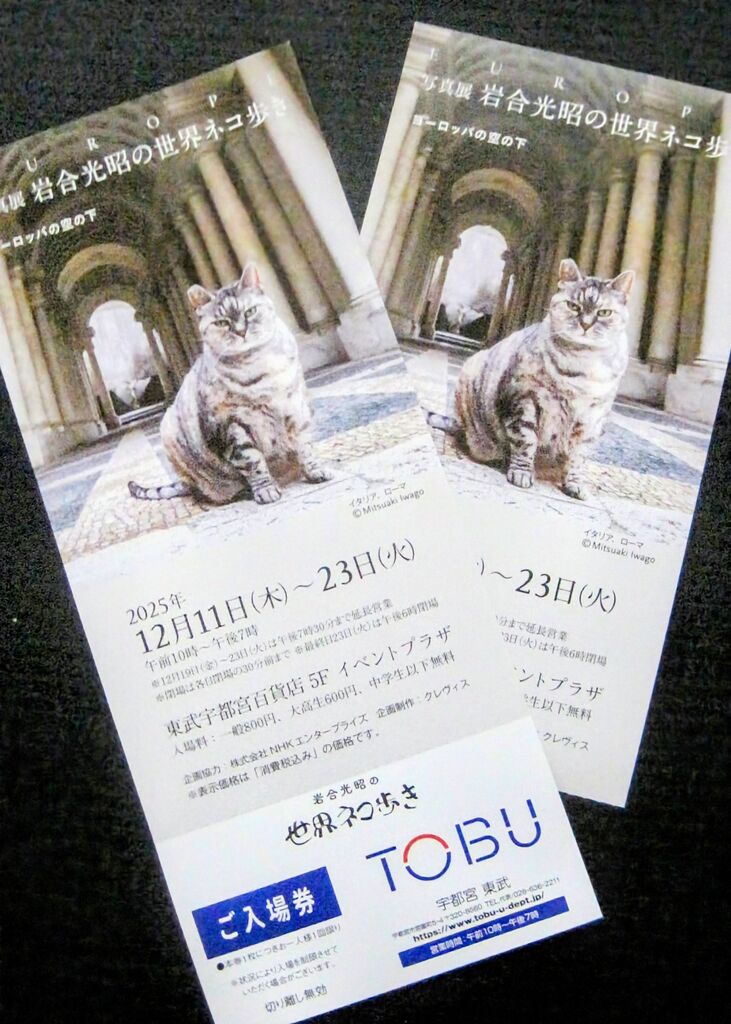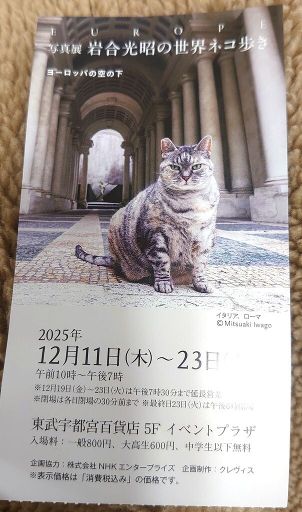 開催中の写真展【岩合光昭の世界ネコ歩き(ヨーロッパの空の下)】に行って来ました(*^^*)。。。写真展は12月11日~23日間の10時~19時(最終日は18時閉場)で開催されています。入場料は一般¥800・大高生¥600・中学生以下無料ですが東武カードやトプポアプリ、LINE会員等の方は提示で¥100引きとなりますよゥ(^o^)v。。。本日はLINEクジで入場ぺあチケットが当たったので、無料で入場して写真展を満喫して来ました(*´∀`)♪。。。しかも!12/13の今日は、岩合光昭さんのトークショウ&サイン会が有ります♪ヽ(´▽`)/。。。久しぶりの岩合光昭さんの写真展!トークショウ!サイン会で短い時間ですがお話しすることもでき、最後に握手もして頂いて大満足の一日でした(*´ω`*)。。。動物写真家の岩合光昭さんはネコ好きには堪らない方で、今回の写真展でも写真の下にネコの名前や撮った場所、シュチエーション等のコメントが添付されていて見応えの有る作品ばかりで時間がたつのも忘れ魅入ってしまいました(*^^*)。。。当選したペアちけの残りの一枚!次はいつ観に行こうかなぁ(*´∀`)♪。。。【岩合光昭の世界ネコ歩き(ヨーロッパの空の下)】ネコ好きの方!必見です( ^-^)ノ∠※。.:*:・'°☆ (訪問:2025/12/13)
