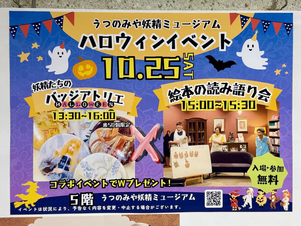 うつのみや妖精ミュージアムさんでは、ハロウィンのイベントで、妖精たちのバッジアトリエや絵本の読み語り会など行われています(*´ω`*)無料のイベントが多いので家族で気軽に参加もしやすいです♪ (訪問:2025/09/29)
