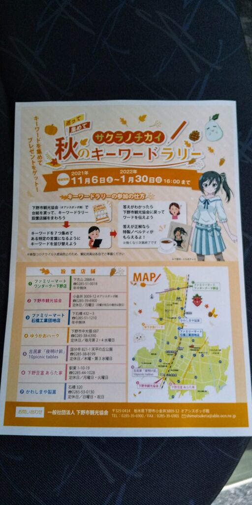 本日から開催される秋のキーワードラリーの台紙をもらう為に訪れました。7か所の店舗を巡り店内に貼られている文字が書かれたキーワードを記入し並べ替えて解答を出すというものです。観光協会も設置店になっていてコノ場で一つキーワードが埋まりました。どんな答えになるのか楽しみです。 (訪問:2021/11/06)