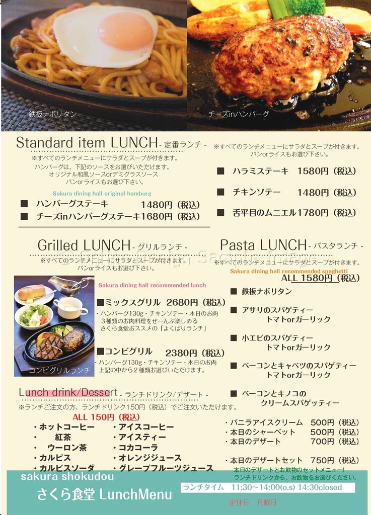 宇都宮市の洋食・ステーキ・ハンバーグ・カフェ・喫茶店 クチコミ94件 サクラショクドウ さくら食堂 050-7586-3837 050-7586-3837 お気に入り クチコミする 基本情報 メニュー クチコミ 写真 地図 最新情報 求人 ランチ ディナー TakeOut ランチ ランチメニュー メニュー一覧 ランチ 1400円(税込)~ その日の、サラダ+スープが付きます! パスタランチ以外のランチには、ライスorパンも付きます。 ランチタイムに限り、ライスのおかわりが出来ます。 追加+150円(税込)で、ランチドリンクも付けられます。 平日日替り限定ランチ 1400円(税込) 平日だけの、お得なランチ!! 定番の生姜焼き・おむらいす に加え、日替わりランチだけのミックスフライも!毎日が楽しみです♪お待ちしております(*゚▽゚)ノ スペシャル ステーキランチ 3880円(税込) さくら食堂厳選! 和牛ステーキを、ランチのセットメニューで お召し上がりいただけます✨ ランチメニュー以外にも、単品メニューのご注文もいただけます! ランチ ディナー TakeOut 栃ナビ! 栃木県のお店・スポット情報 食べる 洋食 洋食 さくら食堂 ランチ