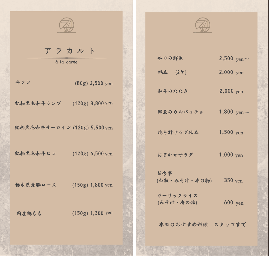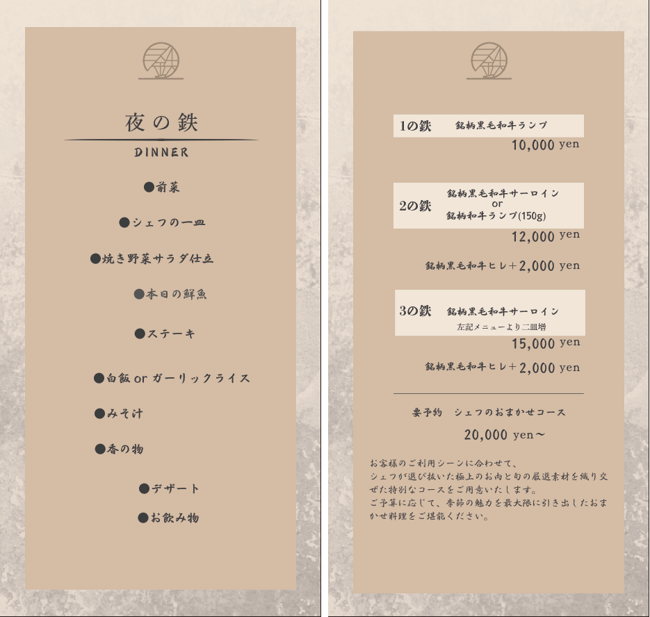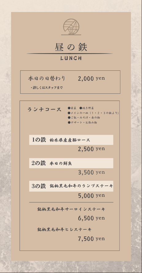 宇都宮市の鉄板焼き・洋食・ステーキ・ハンバーグ・テイクアウト・創作和食 クチコミ12件 テッパンヤキサンノテツ 鉄板焼 三の鉄 028-611-3629 028-611-3629 お気に入り クチコミする 基本情報 メニュー クチコミ 写真 地図 最新情報 求人 雰囲気 お料理 メニュー メニュー 友人宅に訪れたような気さくな空間。食材に合わせた、枠にとらわれない調理法。 お客様とのコミュニケーションを大切にし、できる限りお客様のわがままに応えたい。 それが、三の鉄が目指す鉄板料理です。 昼の鉄/LUNCH 昼の鉄/LUNCH 本日の日替わり ● 詳しくはスタッフまで ランチコース ・前菜 ・焼き野菜 ・メインの一皿(1・2・3の鉄より) ・ご飯、みそ汁、香の物 ・デザート・お飲み物 【1の鉄】栃木県産豚ロース 2,500yen 【2の鉄】本日の鮮魚 3,500yen 【3の鉄】銘柄黒毛和牛のランプステーキ 5,000yen ●銘柄黒毛和牛サーロインステーキ 6,500yen ●銘柄黒毛和牛ヒレステーキ 7,500yen 夜の鉄/DINNER ・前菜 ・シェフの一皿 ・焼き野菜サラダ仕立 ・本日の鮮魚 ・ステーキ ・白飯orガーリックライス ・みそ汁 ・香の物 ・デザート ・お飲み物 【1の鉄】銘柄黒毛和牛ランプ … 10,000yen 【2の鉄】銘柄黒毛和牛サーロイン または 銘柄和牛ランプ(150g) … 12,000yen 銘柄黒毛和牛ヒレ+2,000yen 【3の鉄】銘黒毛和牛サーロイン … 15,000yen ※上記メニューより二皿増 銘柄黒毛和牛ヒレ+2,000yen 【要予約】シェフのおまかせコース 20,000yen〜 お客様のご利用シーンに合わせて、シェフが選び抜いた極上のお肉と旬の厳選素材を織り交ぜた特別なコースをご用意いたします。ご予算に応じて、季節の魅力を最大限に引き出したお任せ料理をご堪能ください。 アラカルト/á la carte アラカルト/á la carte 牛タン(80g)・・・2,500yen 銘柄黒毛和牛ランプ(120g)・・・3,800yen 銘柄黒毛和牛サーロイン(120g)・・・5,500yen 銘柄黒毛和牛ヒレ(120g)・・・6,500yen 栃木県産豚ロース(150g)・・・1,800yen 国産鶏もも(150g)・・・1,300yen 本日の鮮魚・・・2,500yen〜 帆立(2ヶ)・・・2,000yen 和牛のたたき・・・2,000yen 鮮魚のカルパッチョ・・・1,800yen 焼野菜サラダ仕立・・・1,500yen おまかせサラダ・・・1,000yen お食事(白飯・みそ汁・香の物)・・・350yen ガーリックライス(みそ汁・香の物)・・・600yen 本日のおすすめ料理 スタッフまで 三の鉄自慢のテイクアウトメニュー ※要予約 三の鉄自慢の味をテイクアウトでもお楽しみください。 ● ステーキサンド(1,200yen) ● ポークジンジャー弁当(1,800yen) ● 和牛ランプ弁当(2,800yen) 雰囲気 お料理 メニュー 栃ナビ! 栃木県のお店・スポット情報 食べる 和食 鉄板焼き 鉄板焼 三の鉄 メニュー
