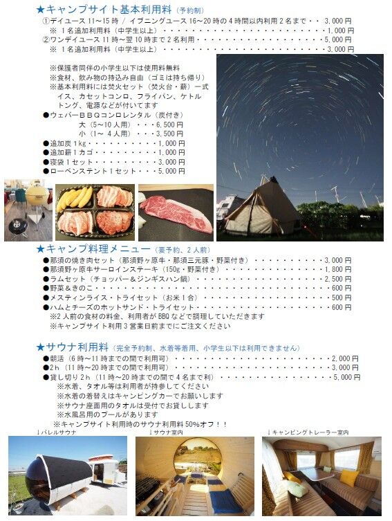 宇都宮市のカフェ・喫茶店・キャンプ場 クチコミ8件 ピィチャンズファームカフェアンドアウトドア ぴぃちゃん‘s ファーム カフェ&アウトドア 080-2551-5891 080-2551-5891 お気に入り クチコミする ネット予約する 基本情報 メニュー クチコミ 写真 地図 最新情報 お食事メニュー 飲み物メニュー アウトドア専用 アウトドア専用 ★★★エンジョイ! アウトドア・メニュー★★★ ぴぃちゃん’sファームの真骨頂! アウトドアのアクティビティを楽しもう! 電車で行けるキャンプ場ってあるの? ハイ!ここにありますよ! ぴぃちゃん’sファームはキャンプ初心者にとっても優しいキャンプ場なんです! キャンプ場といえば大自然の中がいいかな? それだとちょっと大き目な自動車ないと沢山の荷物を詰め込んでの大移動も必要で、まぁ大変ですよね・・・。 車がなければレンタカー借りる? キャンピングギアがなければ買わないとじゃん! ぴぃちゃん’sファームならテントも寝袋も焚火台、イスなどもリーズナブルにセットで借りれるんだよ! ◎キャンピング・ギアのレンタル・メニュー! ① BBQコンロ&炭火セット 大(5~10人用)6,500円、 小(1~4人用)3,500円 ② 追加 チャコール1kg、薪1かご 各1,000円 ③ 厳選!栃木のお肉BBQセット(2人前) 3,000円 ④ 那須野ヶ原牛サーロインステーキ肉(約150g) 1,800円 ⑤ ホットサンド・トライ セット 600円 ⑥ メスティン・ライス トライセット 500円 お食事メニュー 飲み物メニュー アウトドア専用 栃ナビ! 栃木県のお店・スポット情報 食べる カフェ・スイーツ・パン カフェ・喫茶店 ぴぃちゃん‘s ファーム カフェ&アウトドア アウトドア専用