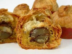 さくさくパイの中に、渋皮つきのおっきな栗が丸ごとゴロン♪ さらにマロンペーストに、さつまいもペーストを混ぜたものが入っています。マロンの優雅な甘さと、さつまいもの自然な甘さが合わさって、それはもう絶品! 食べる前に、オーブントースターなどで少しあっためていただくと、焼き立ての美味しさがよみがえります~オススメ!