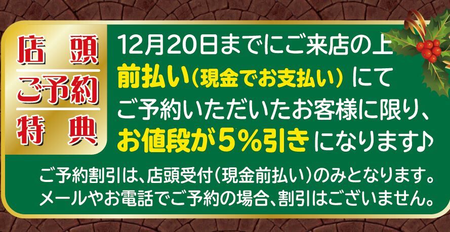 ご予約をいただきますと、商品代金から5%引きとさせていただきます♪ヽ(´▽`)/