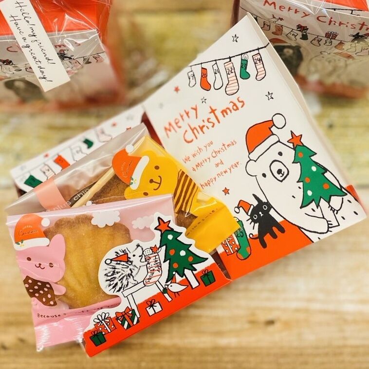 この時期は、クリスマス柄の可愛い袋に入ったお菓子と、クリスマスムード漂うラッピングで、スペシャルなムードを演出しています。