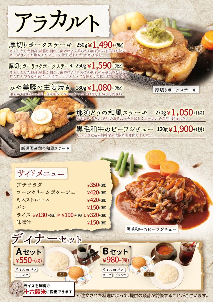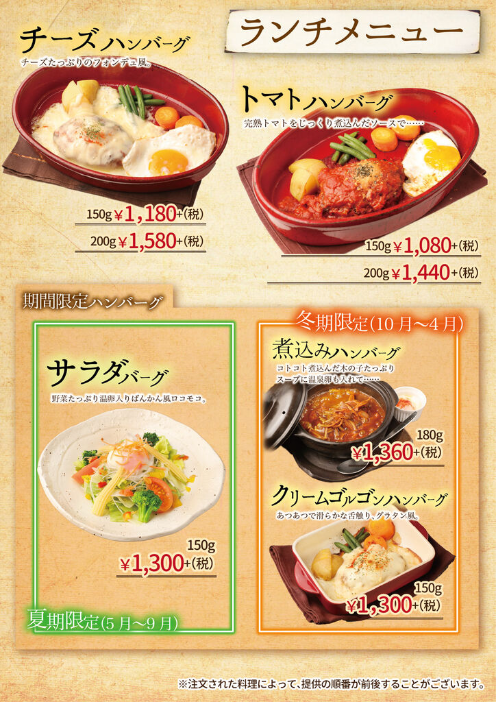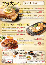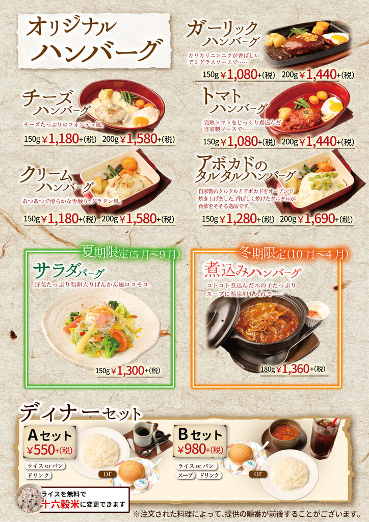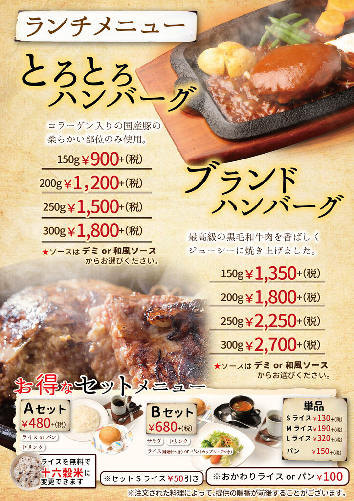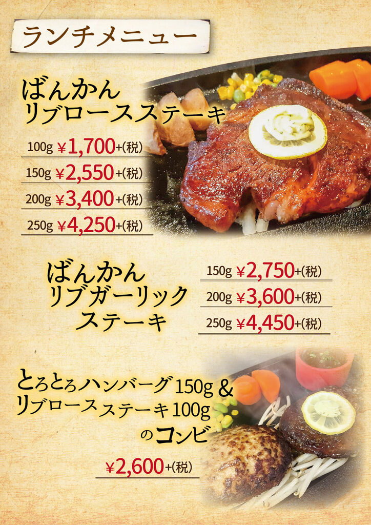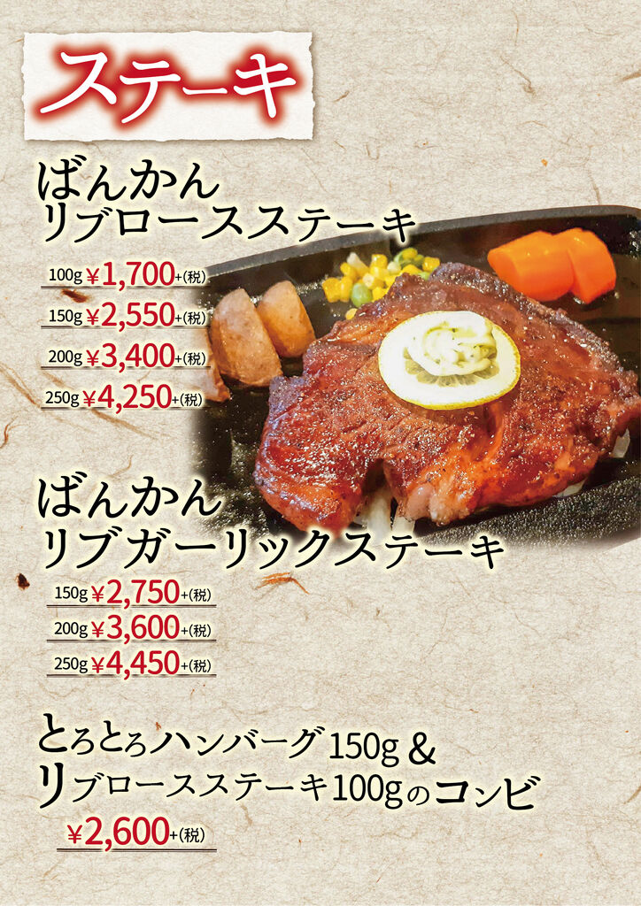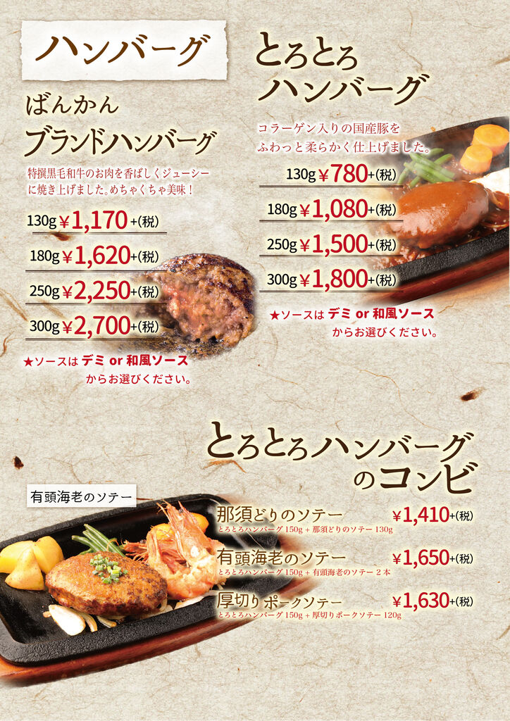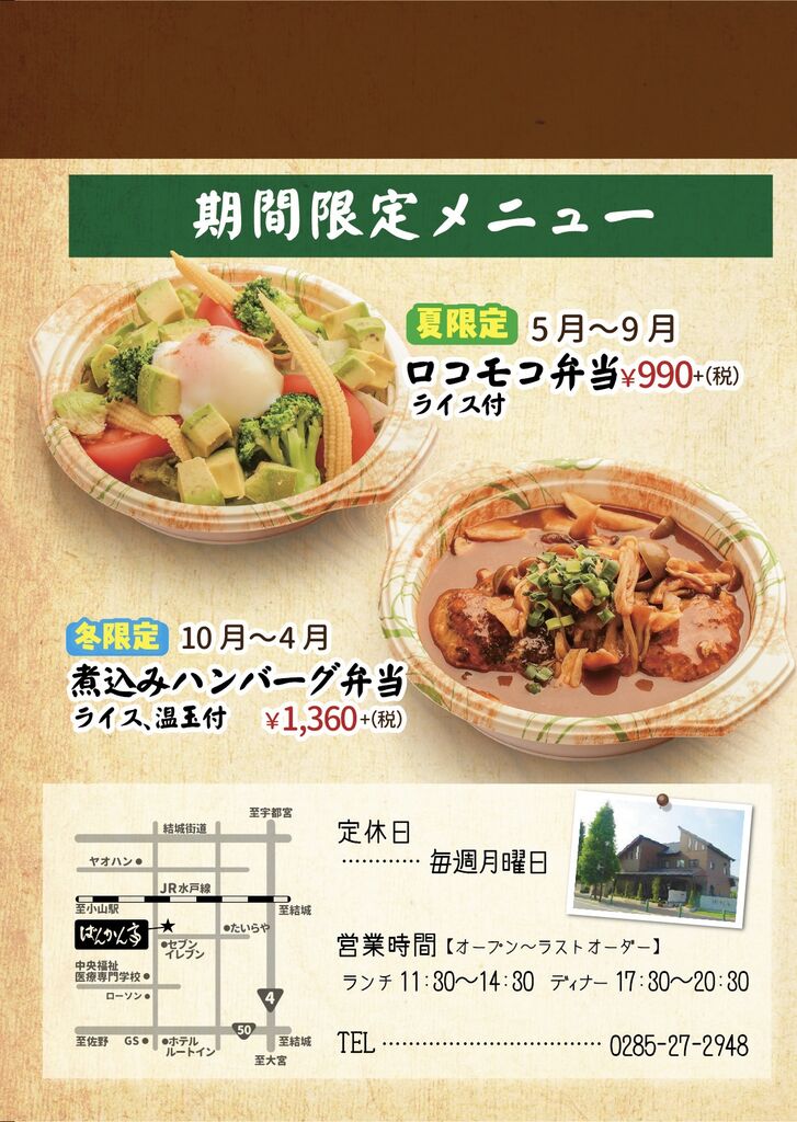 小山市のステーキ・ハンバーグ・レストラン・テイクアウト クチコミ165件 バンカンテイ ばんかん亭 0285-27-2948 0285-27-2948 お気に入り クチコミする 基本情報 メニュー クチコミ 写真 地図 最新情報 求人 メニュー詳細 メニュー詳細 ランチメニュー1 とろとろハンバーグ 当店看板メニュー ばんかん亭といえばとろとろハンバーグ コラーゲン入りの国産豚の やわらかい部位のみを使用しています。 ランチメニュー2 オリジナルハンバーグ いつもと気分を変えたいとき いつもと違うハンバーグはいかがですか? アラカルト ハンバーグ以外のメニューも 充実させております。 お肉は国産の物のみを使用しています 揚げ物はランチ限定の 隠れた人気メニュー ステーキメニュー 当店のもう一つの柱 リブロースステーキは麦黒牛を使用 しつこくない脂としっかりした赤身の旨味が特徴です。 お弁当メニュー1 お弁当メニュー2 とろとろハンバーグコンビ弁当 お弁当でしか味わえない組み合わせを お楽しみください。 特選オリジナルメニュー 当店が自信をもって選んだ 自慢の食材達です 期間限定メニュー 夏は野菜たっぷり温玉入りばんかん風ロコモコ 冬はコトコト煮込んだキノコたっぷり煮込みハンバーグ をお楽しみいただけます ディナー1 ディナーもやっぱりハンバーグ 特選黒毛和牛のお肉を香ばしくジューシーに 焼き上げたブランドハンバーグもオススメです。 コラーゲンたっぷりのとろとろハンバーグを 食べてきれいになりませんか? ディナータイム限定ハンバーグ 夜のみ登場のオリジナルハンバーグもあります。 ぜひ一度お召し上がりください。 お子様にも食べやすいメニューも多数 取り揃えております。 ディナー2 ディナー3 前菜メニュー 前菜 冷菜人気NO1・シーザーサラダ 温菜人気NO1・もちもち明太チーズのオーブン焼き デザート デザートはすべて手作り お食事の後でも重くなりすぎない ように優しい味に仕上げました。 ハーフワイン 飲みきりサイズのワインを 各種取り揃えております。 店内写真 店内写真 メニュー詳細 栃ナビ! 栃木県のお店・スポット情報 食べる 洋食 ステーキ・ハンバーグ ばんかん亭 メニュー詳細