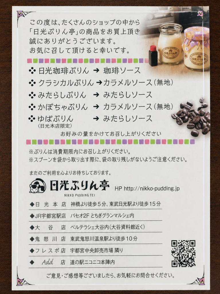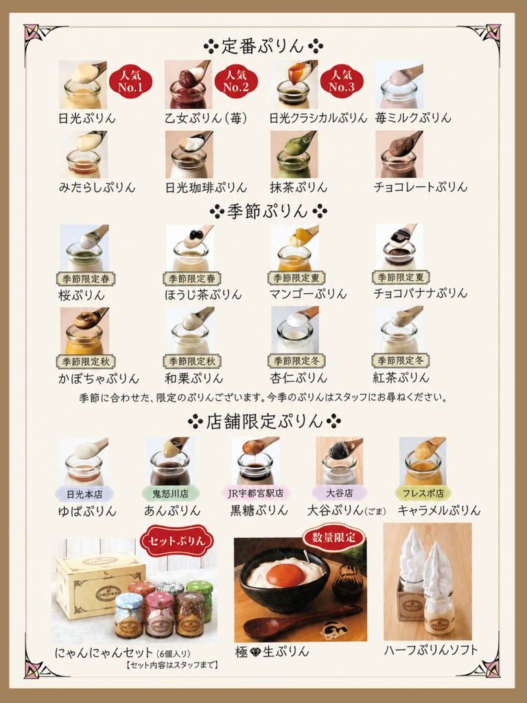 フレスポうつのみや市場さんへ伺ったので、早速寄らせて頂きました!ショーケースの中を覗くと、選ぶのに悩みますね〜(汗)。まずは①【フレスポ店限定】キャラメルぷりん、 ②【当店人気No.1】日光ぷりん、③【当店人気No.3】日光クラシカルぷりん をチョイス♡。私は、キャラメルぷりんをいただきましたが、キャラメル風味がいいですね、そしてなめらか感が他のプリント違うような気がします!美味しい〜〜♡ 瓶も可愛くて、蓋付きですから小物を入れたくなりますね。回収もしていただけます、次回の来店時にぜひ〜。ラッピングも可愛らしいのでお土産にも◎!また伺わせていただきます(*^^*) (訪問:2026/04/24)