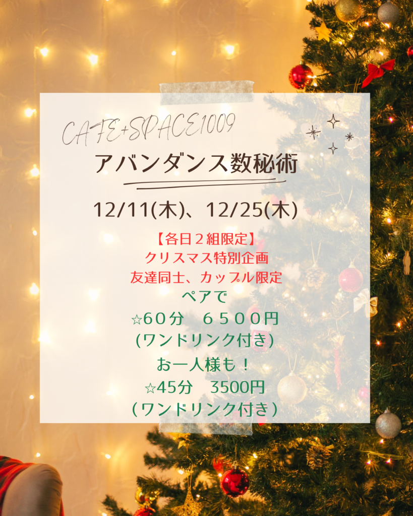 12/25(木)はいつものCAFE+SPACE1009さんで出張鑑定いたします。この日はクリスマス限定企画として、ペア鑑定を行います⭐︎