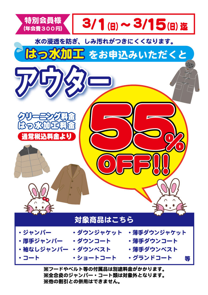 今月は、会員更新をしていただいた特別会員様限定で、クリーニング品&加工代金が通常料金より55%OFFとなる大変お得なセールを開催中です!