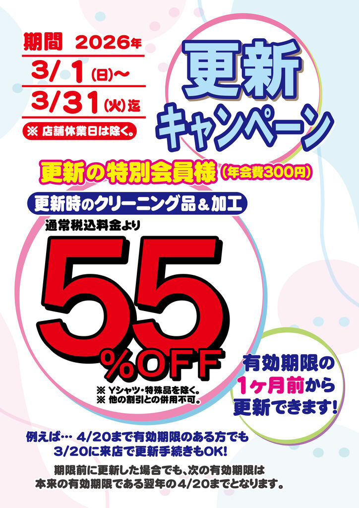 今月は、会員更新をしていただいた特別会員様限定で、クリーニング品&加工代金が通常料金より55%OFFとなる大変お得なセールを開催中です!
