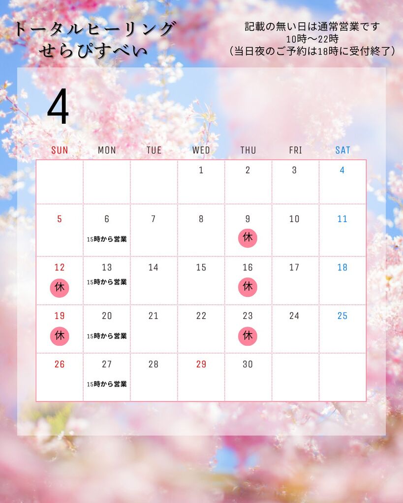 宇都宮市のマッサージ・占い・鑑定・各種療法 クチコミ83件 トータルヒーリングセラピスベイ トータルヒーリング せらぴすべい 090-4136-7686 090-4136-7686 お気に入り クチコミする 基本情報 メニュー・クーポン クチコミ 写真 地図 最新情報 トータルヒーリング せらぴすべいの最新情報 絞り込む ----- お知らせ 予約状況 臨時休業 クーポン 誕生日・記念日 イベント セール情報 テイクアウト 新サービス キャンペーン 求人情報 母の日ニュース 春♪新生活 ときめきニュース 感染対策 ネットショップ お知らせ お見逃しなく!!!(26/04/04) UP 今月からこちらの枠は色々な旬の情報をアップしていきます♪当日のみのキャンペーンもあるかも?!是非、毎日チェックしてみてくださいね(^^♪本日は4月の営業カレンダーです! "ぐッ"ときた! 0人 1 マイニュースに追加 お店・スポット最新情報 栃ナビ! 栃木県のお店・スポット情報 キレイ マッサージ・整体 マッサージ トータルヒーリング せらぴすべい ニュース