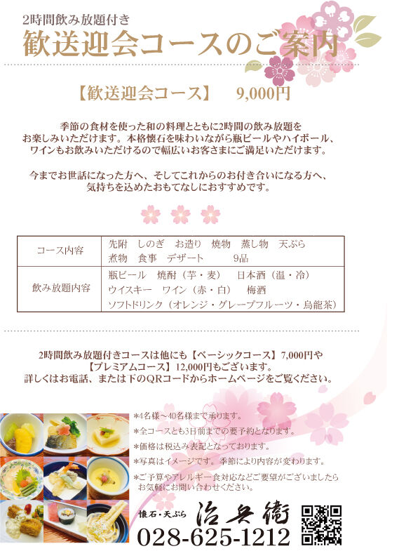 治兵衛では2時間の飲み放題と懐石料理がついたパーティープランを3種類ご用意しております。