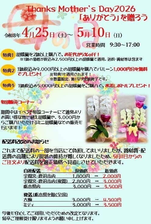 母の日ニュース 今年は“特別”を贈ろう。母の日限定♪蘭のご褒美フェア開催!(26/04/28)