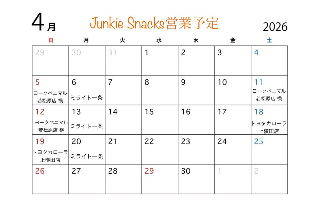 お知らせ Junkie Snacks(26/03/28)